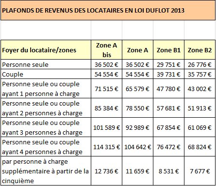 Les plafonds de ressources pour les locataires en loi Duflot, pour les baux conclus, reconduits ou renouvelés en 2013, sont les suivants :